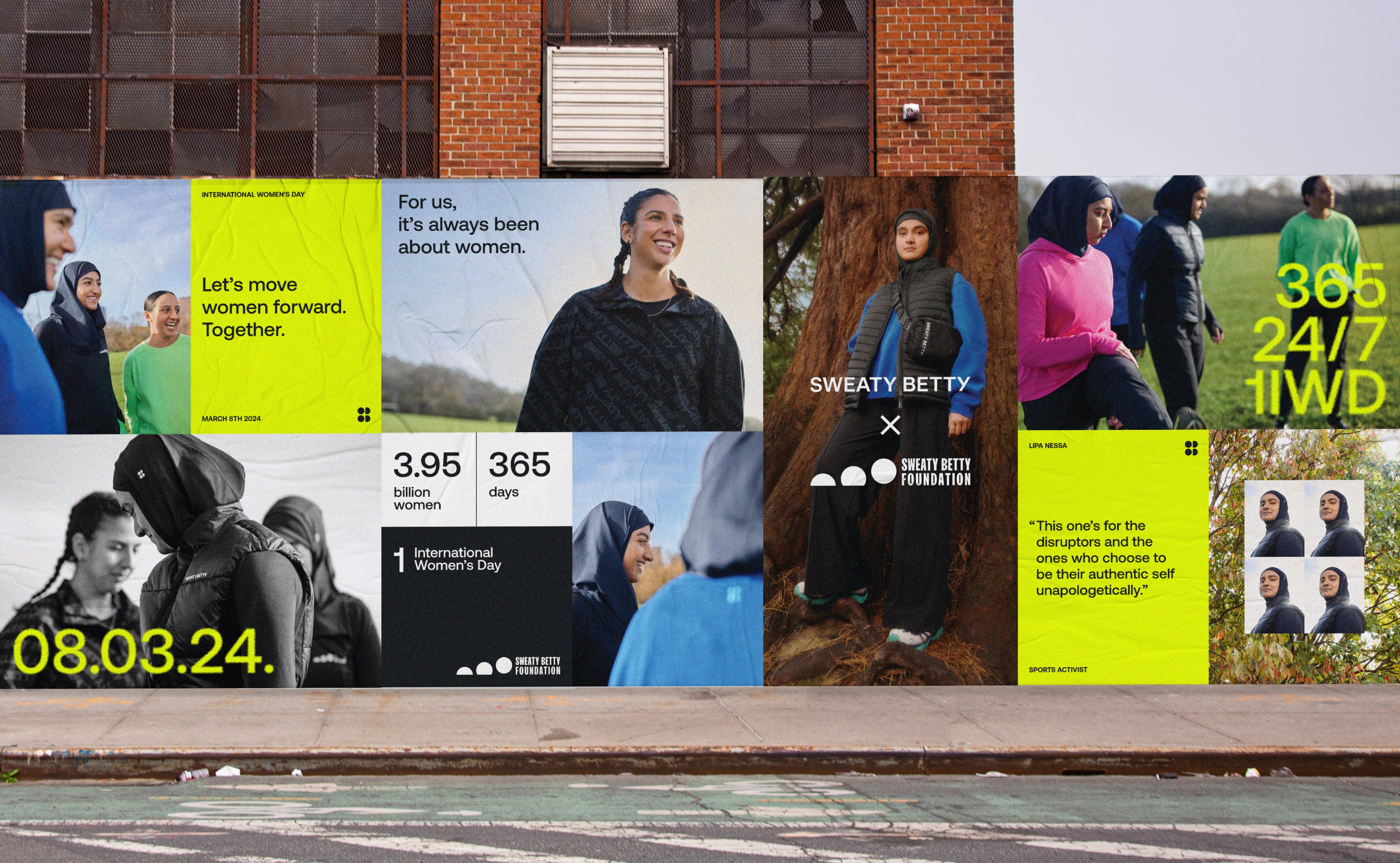 For the design direction of the campaign it was important for it to include stats, but to also feel approachable and not corporate. I stuck to a stripped back colour palette that combined the brand colours for both Sweaty Betty and Sweaty Betty Foundation, and teamed this with a collage of group shots, portraits and typography to display profound messages.
