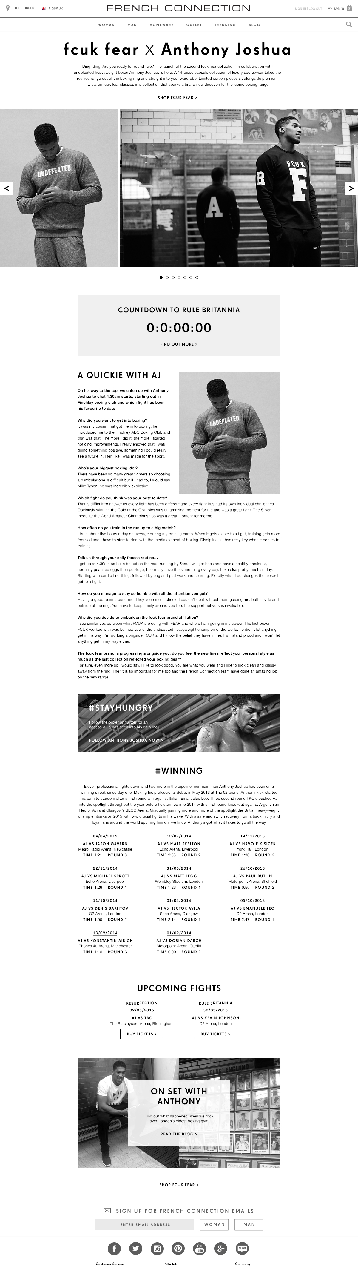 Create a responsive landing page feature and email celebrating the launch of the second fcuk fear collection, in collaboration with undefeated heavyweight boxer Anthony Joshua.
